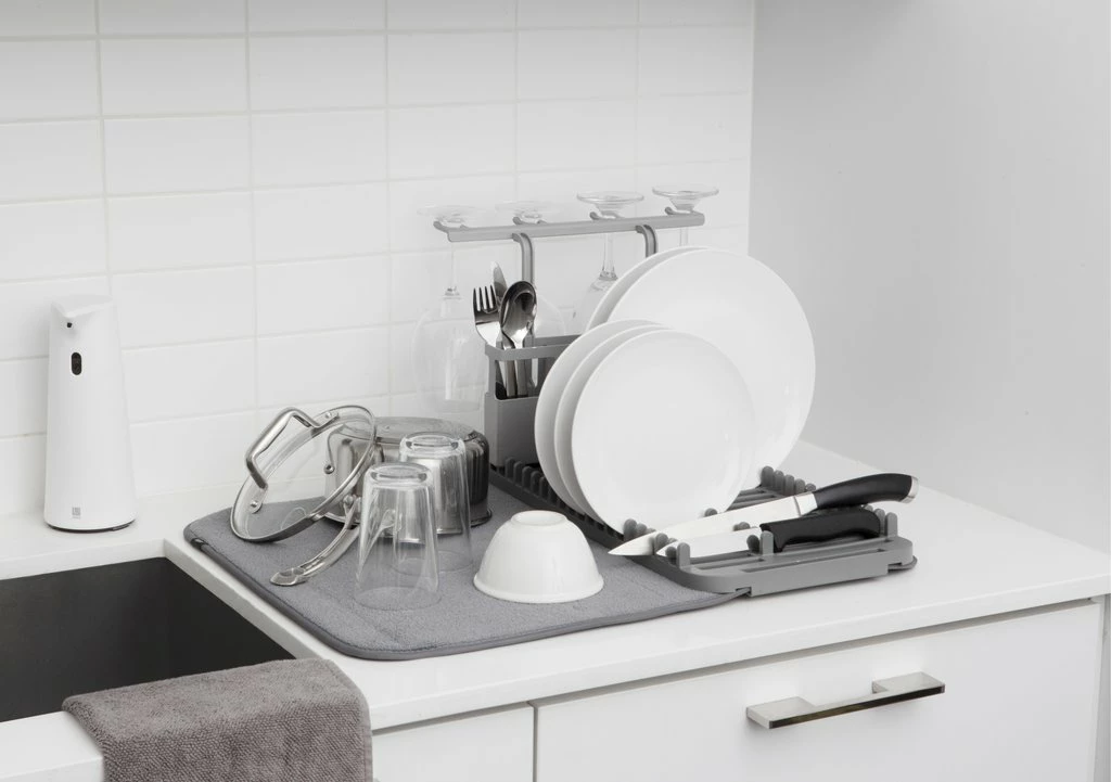 Umbra’s UDry combines a dish drying rack, utensil caddy, stemware holder and dish drying mat in one so you can neatly stack and organize your dishes, glasses, cutlery, pots, pans and more, allowing them to air-dry while you get on with your day.